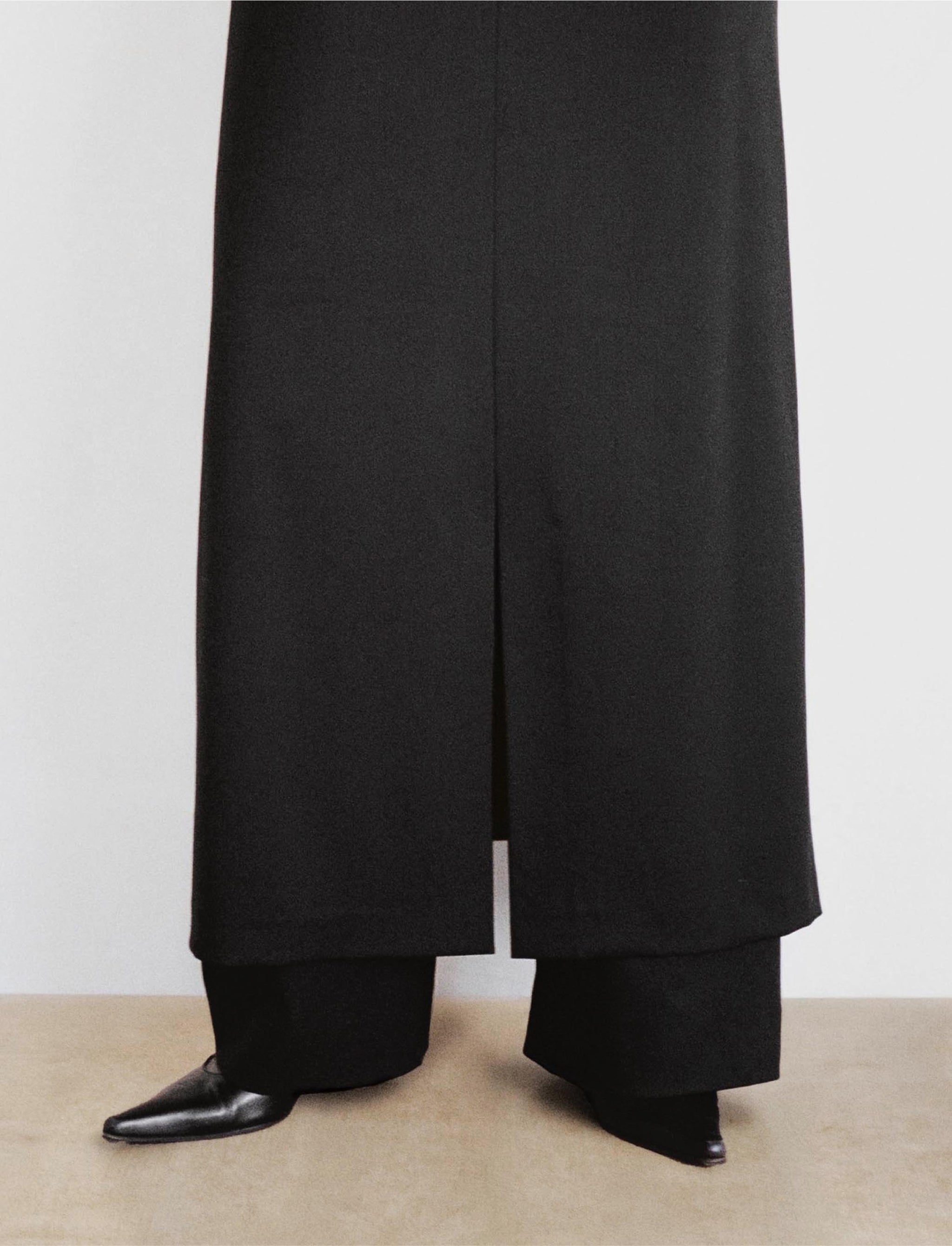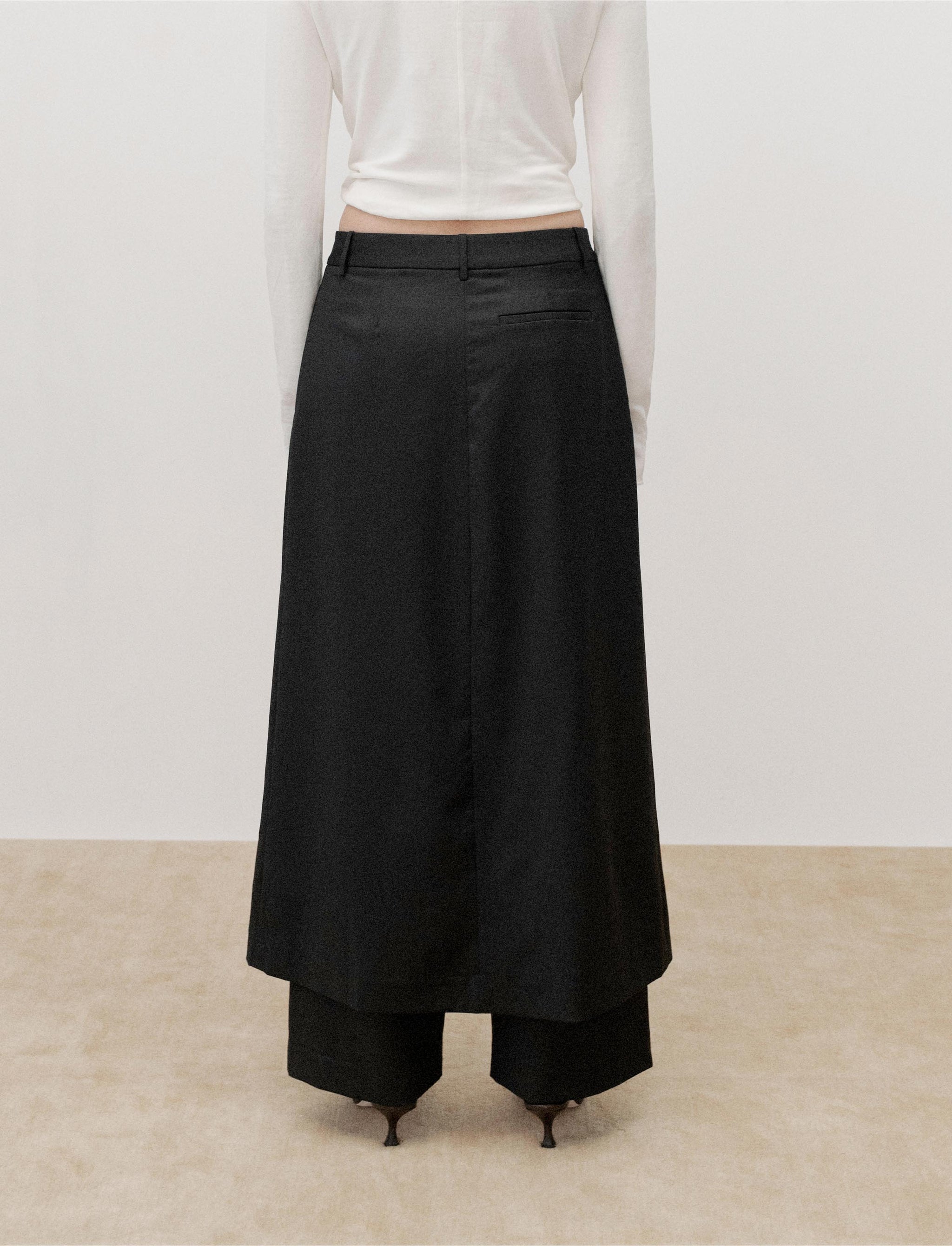 Slightly A-line, mid-rise skirt draped over our straight wool pant, joined at the waistband to create a sleek, highly wearable piece with an unexpected bottom.