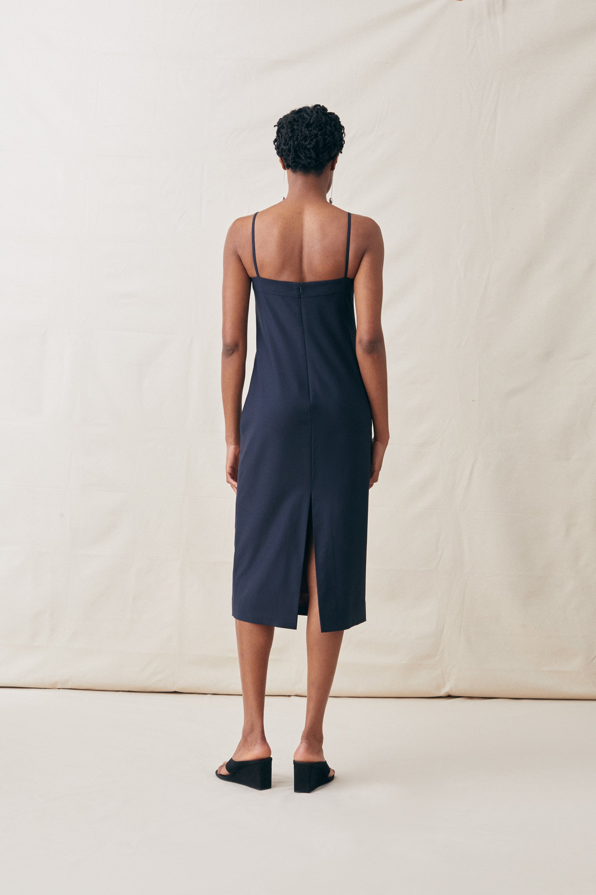 Slip-like dress in Italian wool twill with a high yoke that cuts cleanly across the chest, creating a subtly flattering line through the bodice.