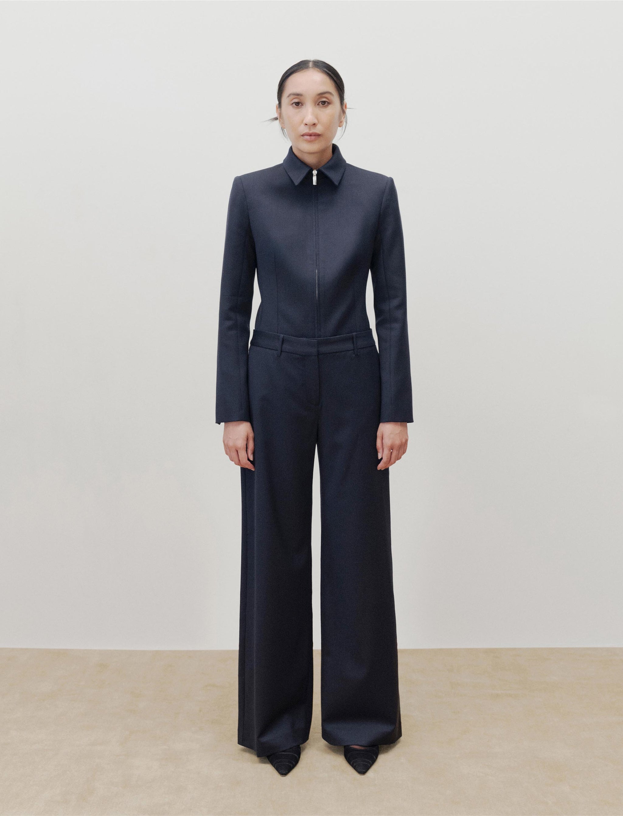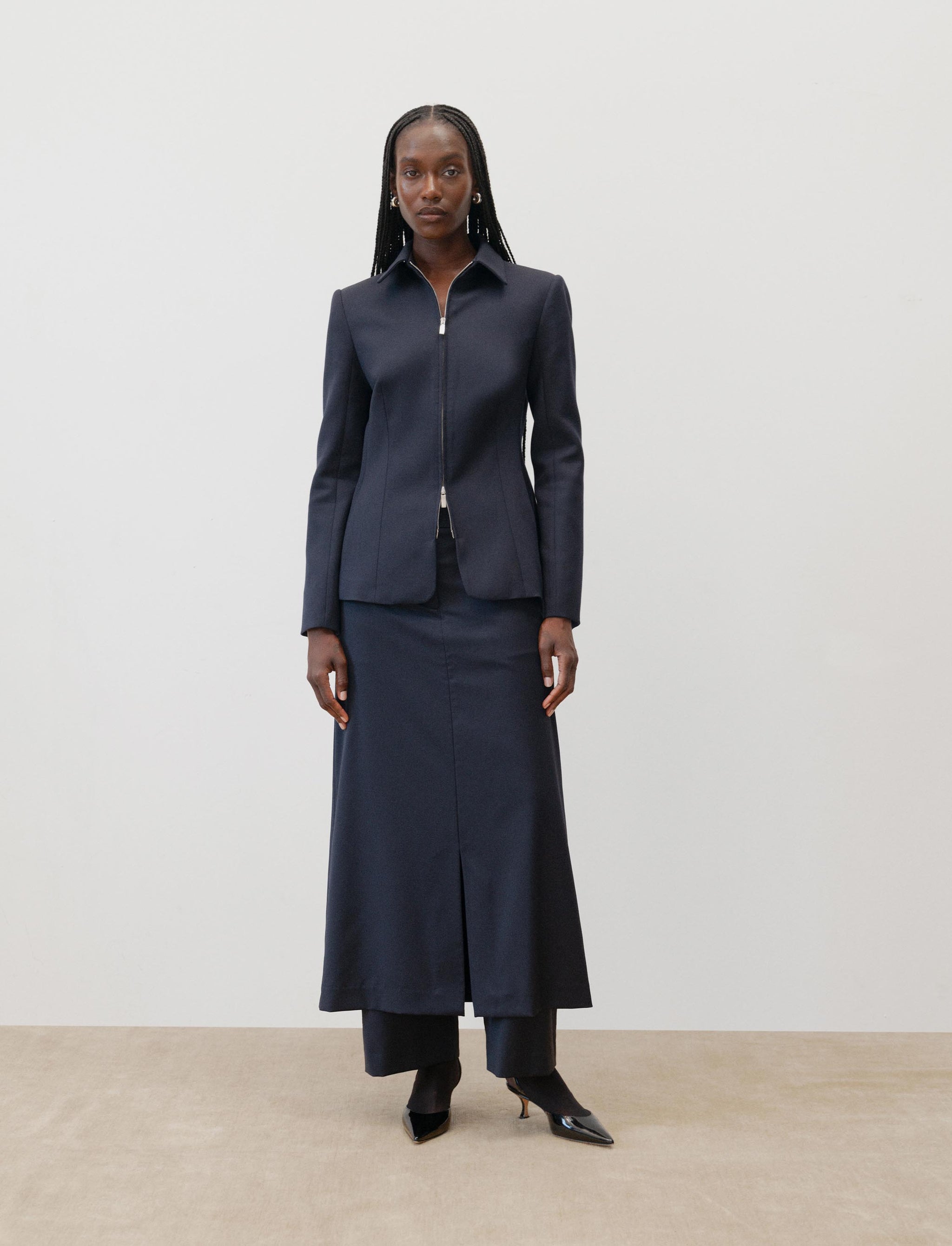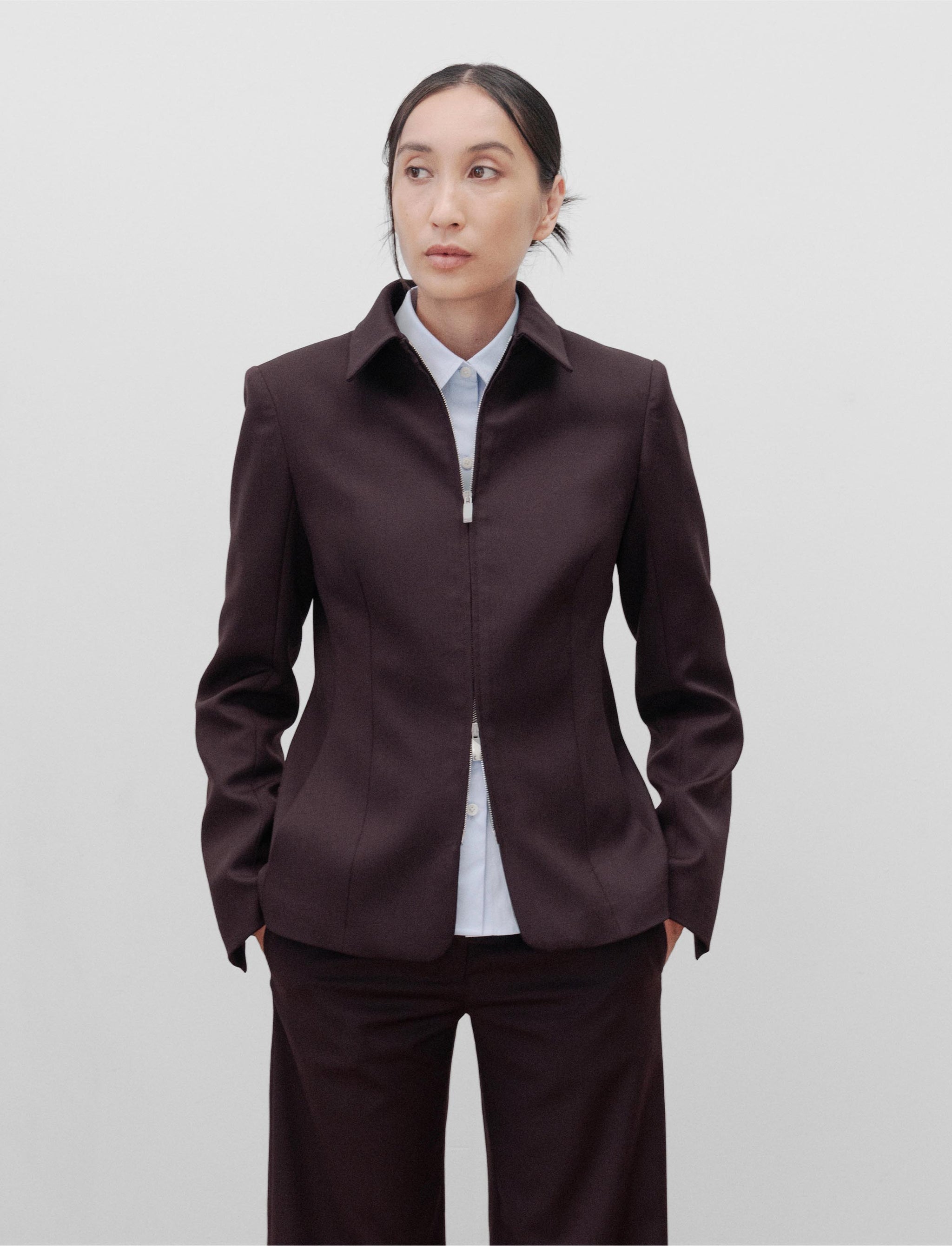 This piece reinterprets our classic blazer with a two-way zip closure, designed for versatility and ease of wear. Contoured seams shape the waist, creating a silhouette that intersects refinement and utility.